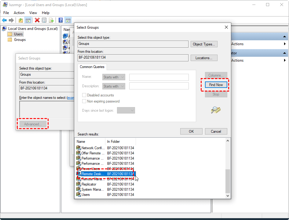 Step 4. Click Advanced first, then click Find Now in the pop-up window. From the list, find and double-click Remote Desktop Users and then click OK.
